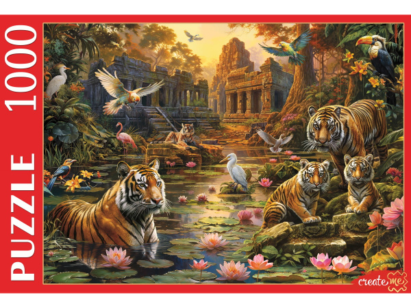 —ПАЗЛЫ 1000 элементов. ТИГРЫ У ОЗЕРА НА ЗАКАТЕ, Ф1000-9939