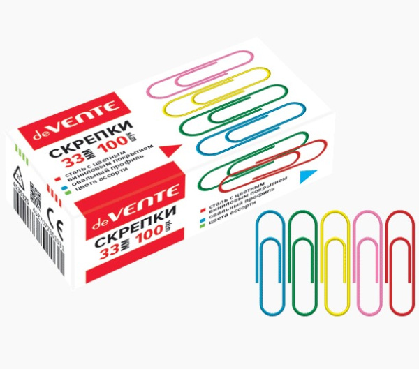 —Скрепки металлические 'deVENTE' овальные цветные 33 мм, 100 шт в картонной коробке, 4135325