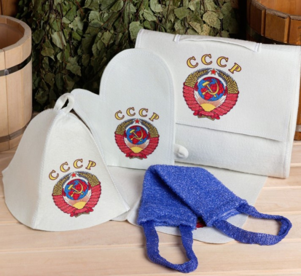 —Набор для бани и сауны 5 в 1 (сумка,шапка,варежка,коврик,мочалка), с принтом 'СССР', белый, 5433223