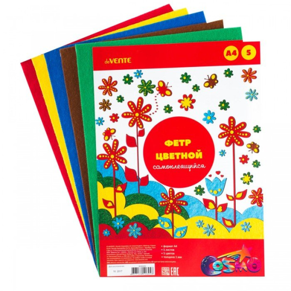 Фетр цветной мягкий самоклеящийся A4 'deVENTE. Яркие цвета' 5 цв, 5 л, толщина 1 мм, 8040690