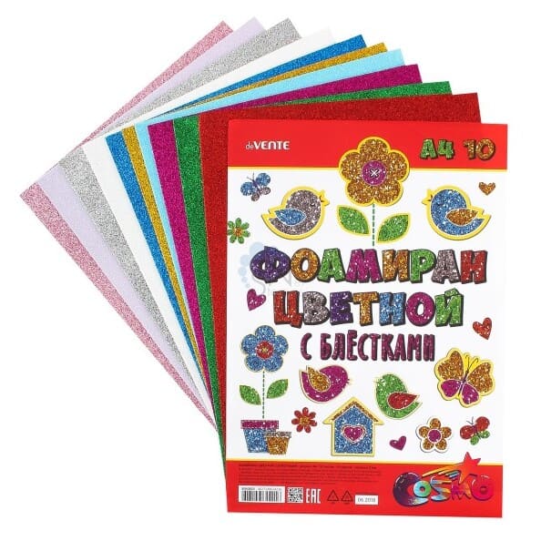Фоамиран цветной с блёстками A4 'deVENTE' 10 цв, 10 л, толщина 2 мм, пластиковый пакет, 8040820